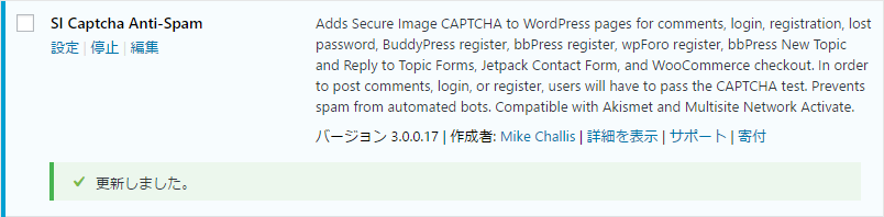WordPress の管理画面で、プラグインが更新できると表示があったため、開いてみると SI CAPTCHA Anti-Spam のバージョンがあがったようで。 更新をしてみたら。