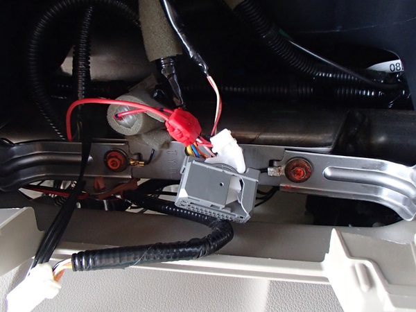 一度コネクターを抜いて、ナビ裏から小物入れにケーブルを通す。 隙間に余裕はあるが、なかなかそこを通ってくれない。